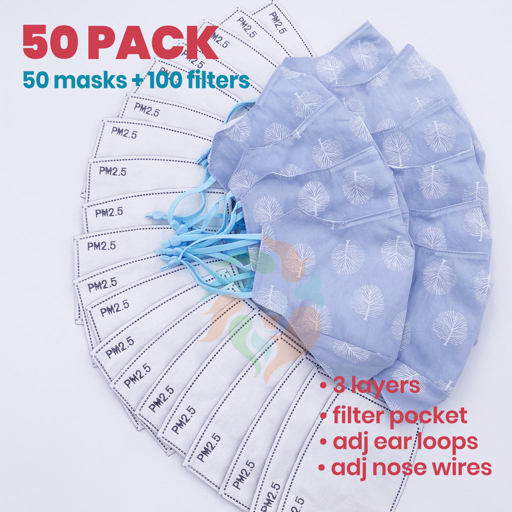 [50 PACK] Blue Tree Printed Linen Cotton 3 Layer Mask + Filters
