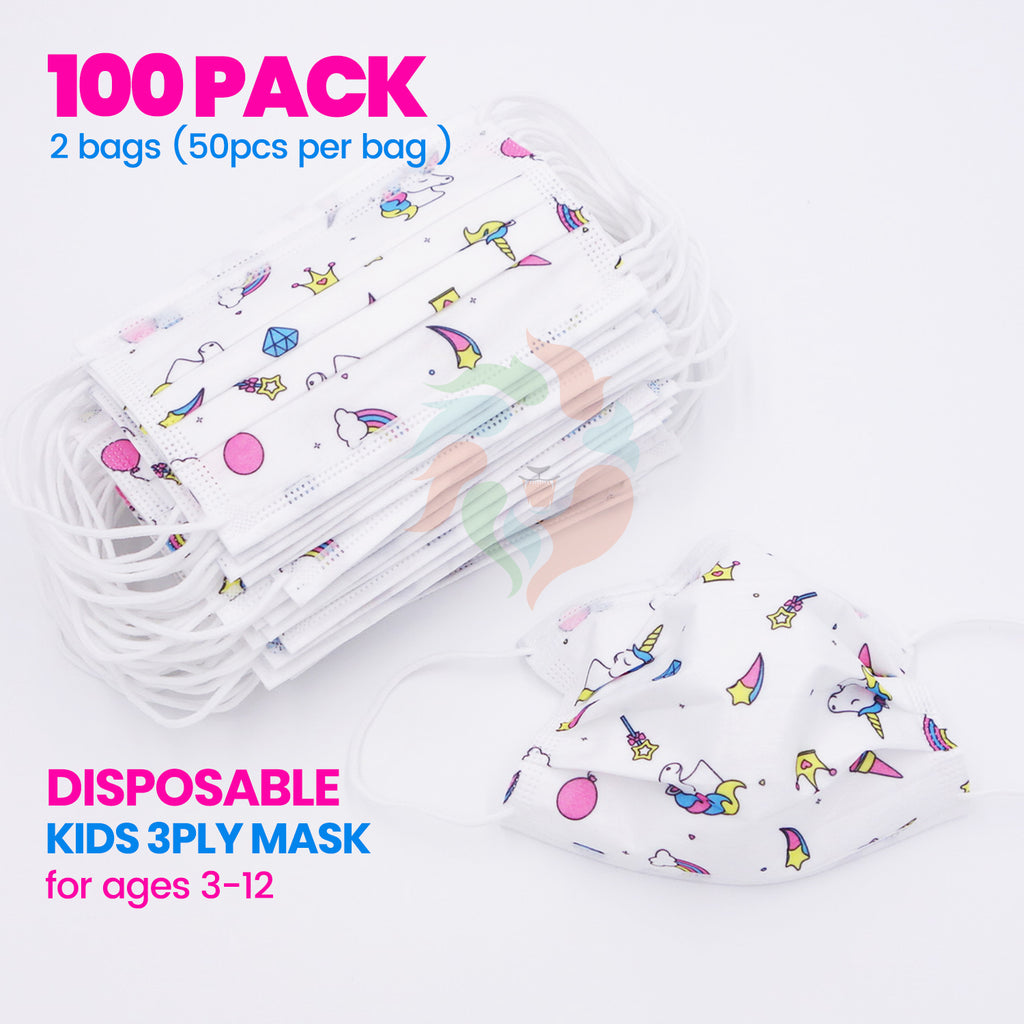 [100 PACK] Kids Disposable Mask 3 Ply Non-Medical-WHITE UNICORN
