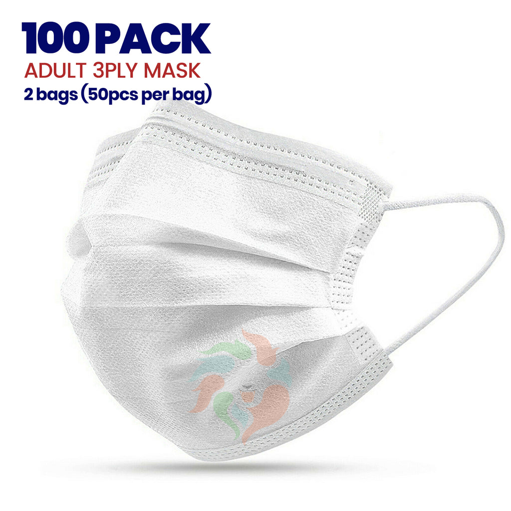[100 PACK] WHITE 3ply Disposable Adult Mask