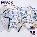 [10 PACK] Blue Dinosaurs Kids Cotton Valve Mask with Filters