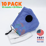 [10 PACK] Blue Plaid Cotton 3 Layer Mask with Valve + 2 Filters