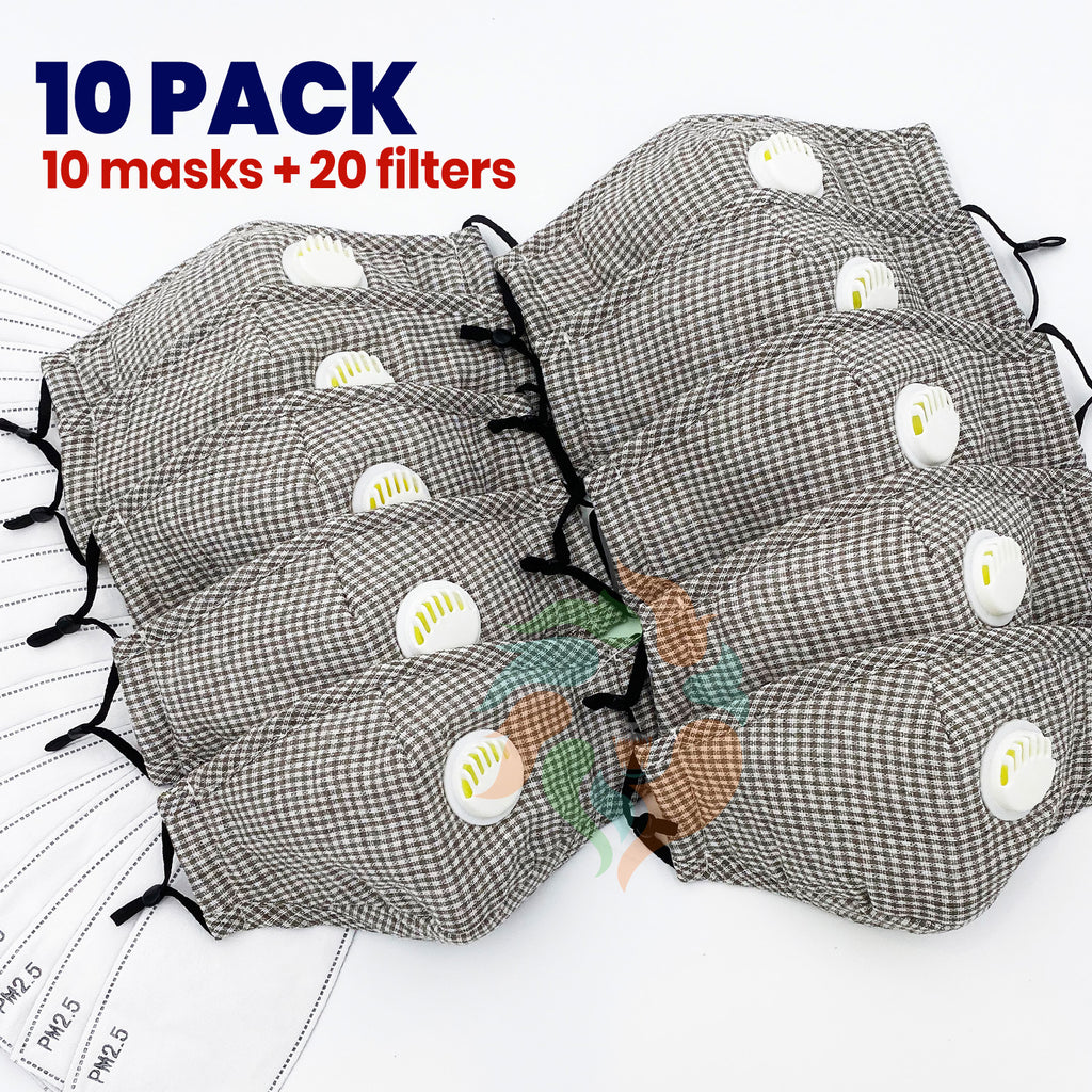 [10 PACK] Gray Plaid Cotton Face Mask with Valve + Filters