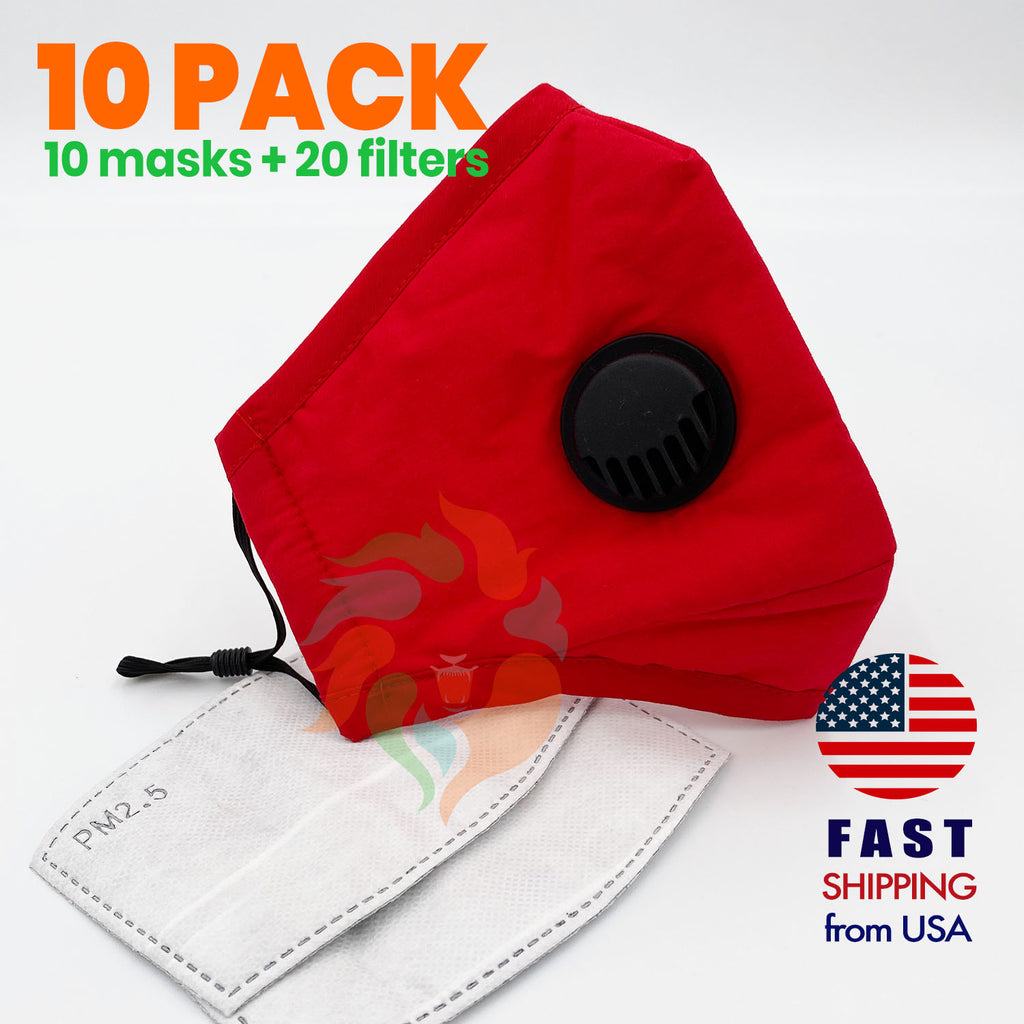[10 PACK] Red Cotton 3 Layer Mask with Valve + 2 Filters