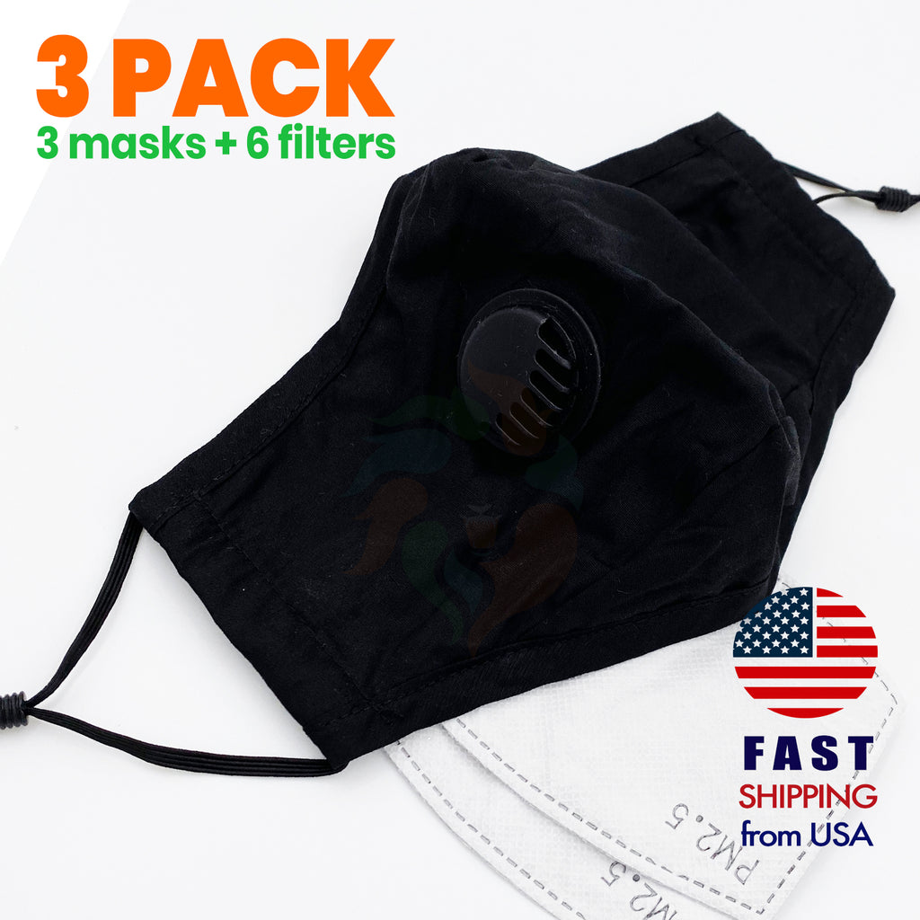 [3 PACK] Black Cotton 3 Layer Mask with Valve + 2 Filters