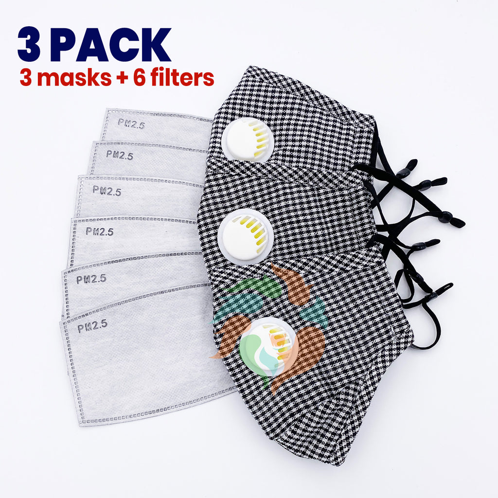 [3 PACK] Black Plaid Cotton Face Mask with Valve + Filters