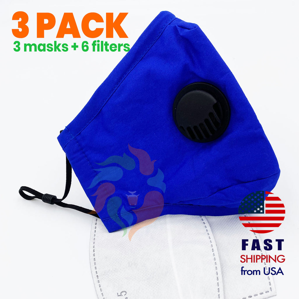 [3 PACK] Blue Cotton 3 Layer Mask with Valve + 2 Filters