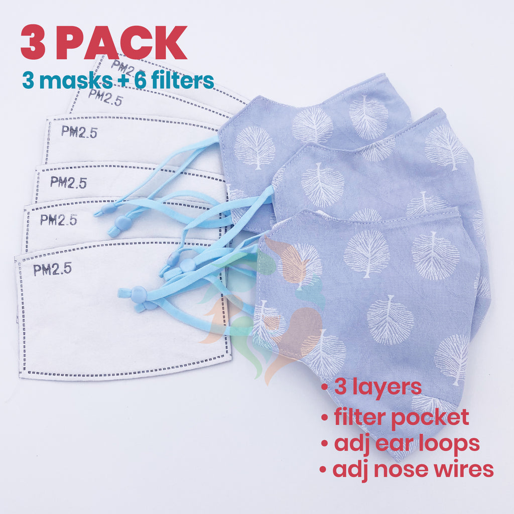 [3 PACK] Blue Tree Printed Linen Cotton 3 Layer Mask + Filters