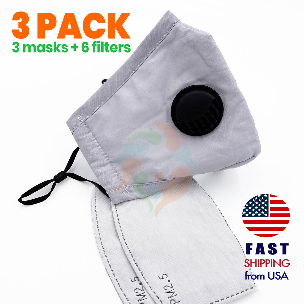 [3 PACK] Gray Cotton 3 Layer Mask with Valve + 2 Filters