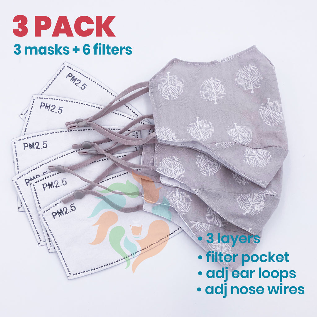 [3 PACK] Gray Tree Printed Linen Cotton 3 Layer Mask + Filters