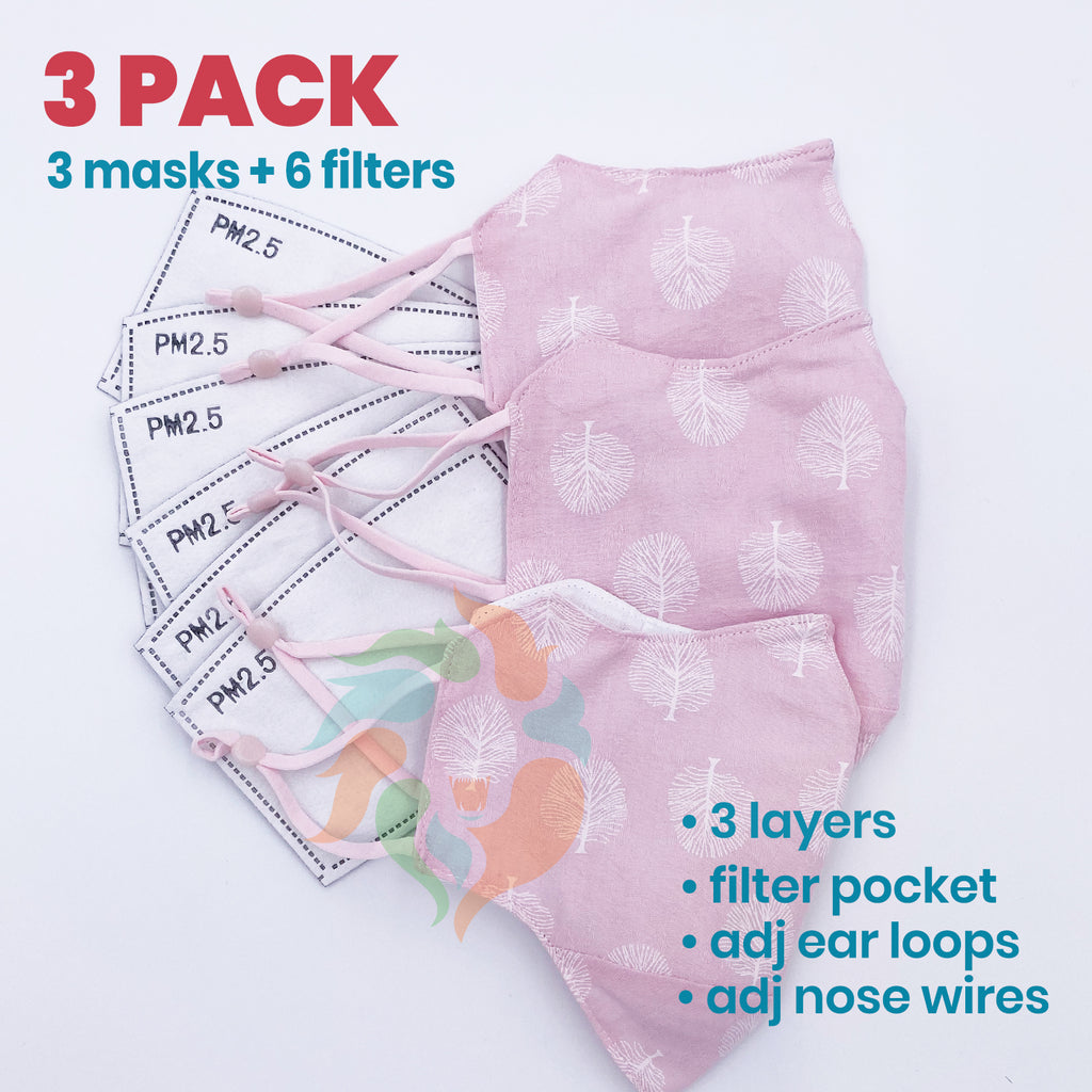 [3 PACK] Pink Tree Printed Linen Cotton 3 Layer Mask + Filters