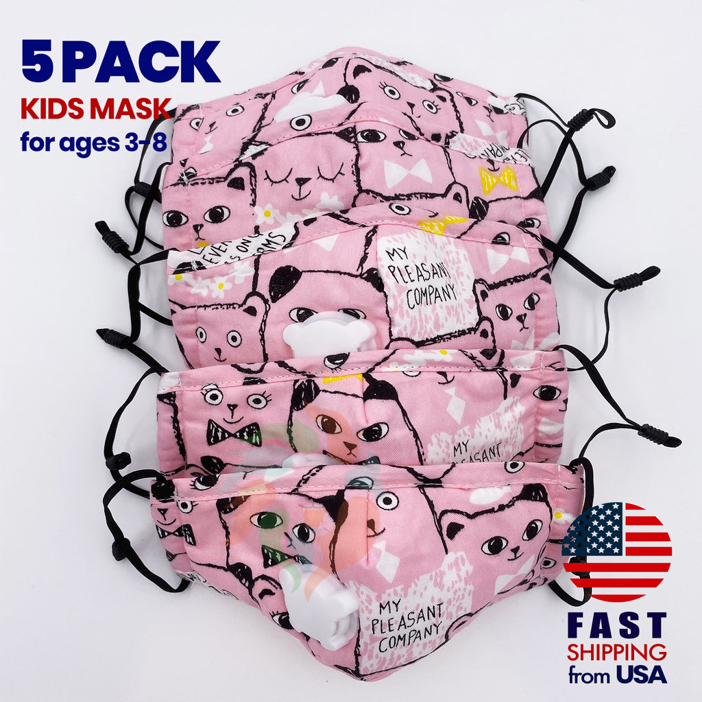 [5 PACK] Pink Kitty Bear Kids Cotton Valve Face Masks- NO FILTER