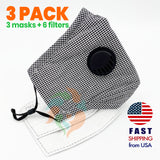 [3 PACK] Black Plaid Cotton 3 Layer Mask with Valve + 2 Filters