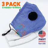 [3 PACK] Blue Plaid Cotton 3 Layer Mask with Valve + 2 Filters
