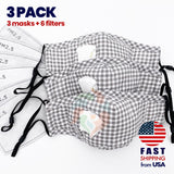 [3 PACK] GRAY Plaid Kids Cotton Breathing Valve Mask with Filters